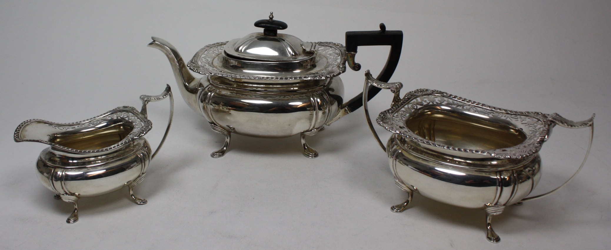 Sheffield 1916, comprising tea pot, twin handled sugar bowl and milk jug, the baluster bodies with lobed corners and everted pierced and gadrooned rims (3)