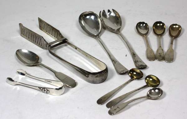 mainly George III, mainly teaspoons and salt spoons; together with a pair of Edwardian asparagus tongs London 1910, of simple form and a modern pair of salad servers (qty)