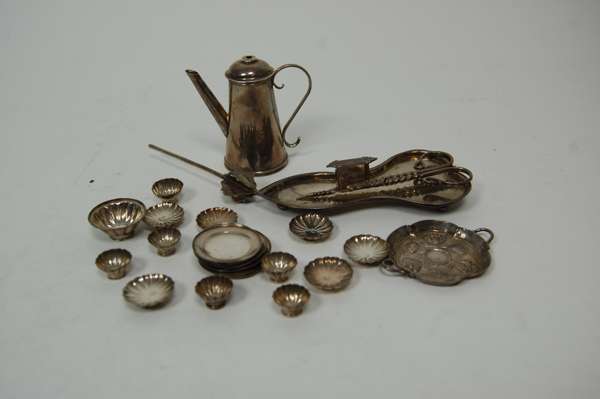 to include a Georgian style chocolate pot and stirrer, candle snuffers and tray, a group of tea bowls and saucers, a set of plates etc (qty)
