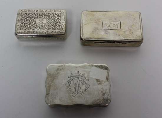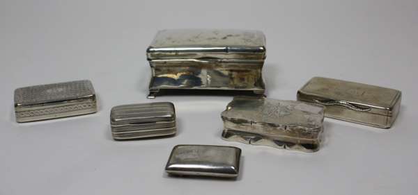 to include a simple rectangular snuff box N Mills, Birmingham 1830; a large snuff box of good gauge, Chester 1919; a reeded example Birmingham 1809; an engraved example, Birmingham 1817; together with a small patch box and a dressing table box (6)