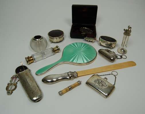 each with silver base and hoof feet with tortoiseshell inlaid hinged covers; together with various small items of silver to include a set of cocktail sticks, glasses case, hand mirror, scent bottle etc (qty)