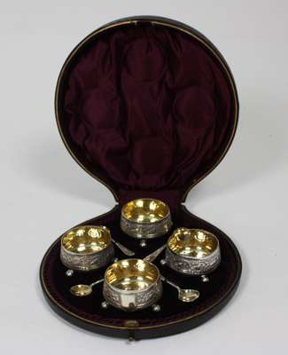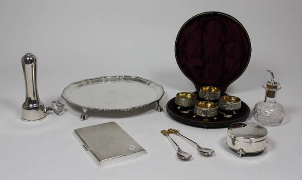 T Bradbury & Sons, London 1896, of shaped circular outline with gadrooned border and presentation inscription, raised on four claw and ball feet; together with an engine decorated cigarette case, a small dressing table box, a silver topped oil bottle and a set of four silver plated salts etc (qty)