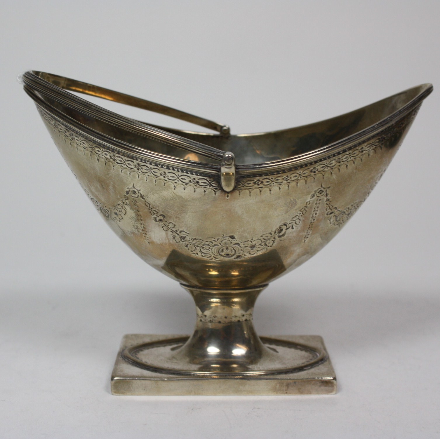 London 1786, of navette outline with engraved border and foliate swags, on a simple stem and rectangular foot, the swing handle with reeded decoration