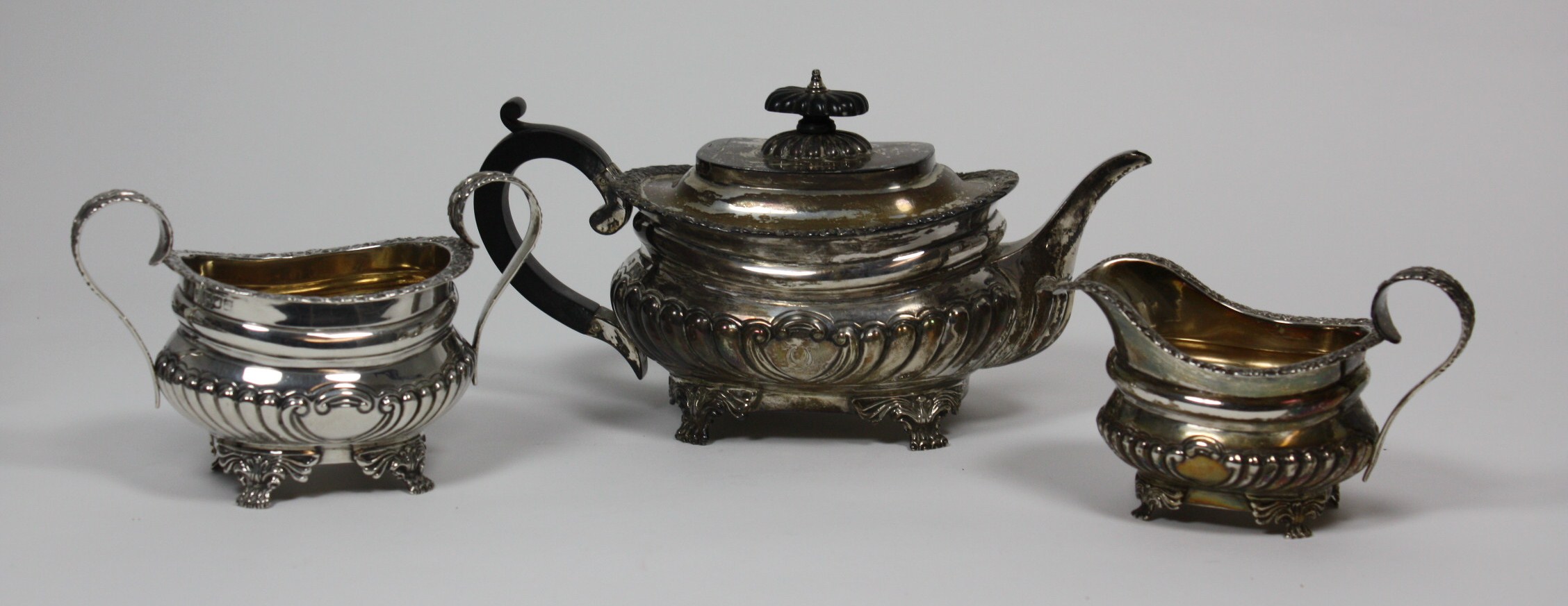 C S Harris, London 1902, comprising teapot, twin handled sugar bowl and milk jug, each with gadrooned baluster body and everted floral rim, raised on bracket and paw feet (3)