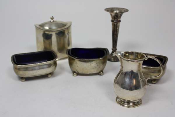 London, circa 1901, of straight sided navette form with hinged cover and toothed border, together with a baluster cream jug and three George III open salts