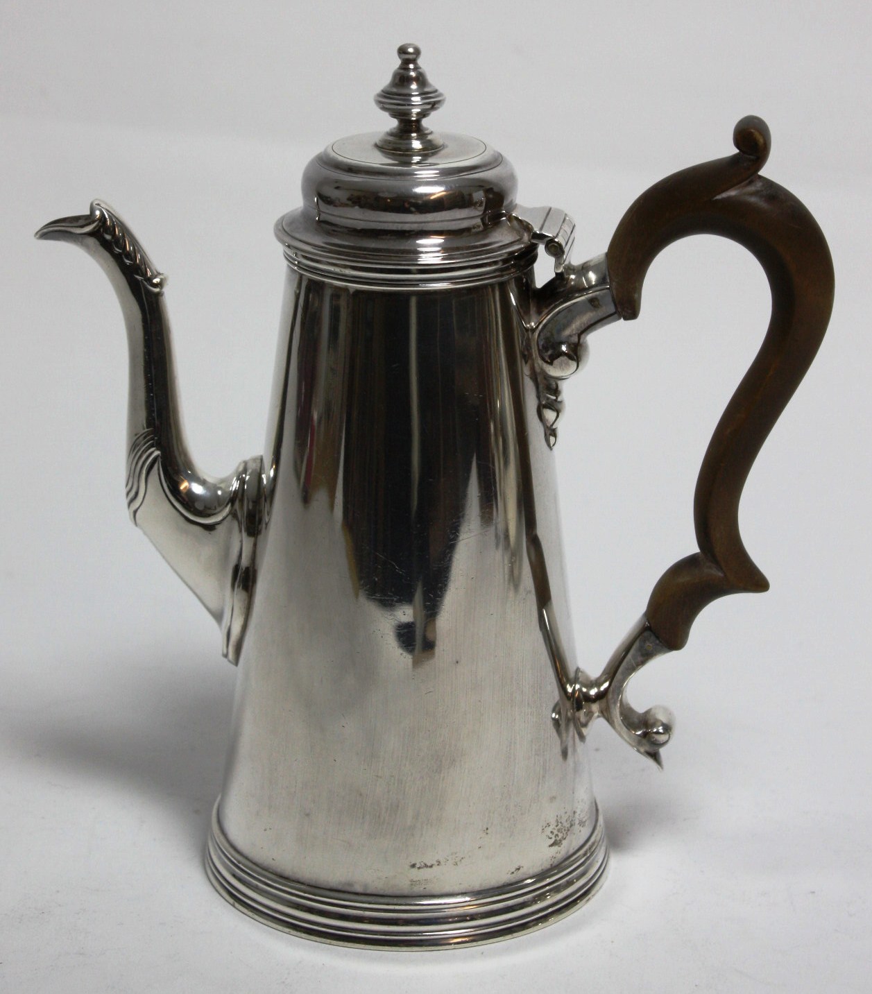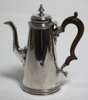 Sheffield 1891, the flared body with reeded foot rim and domed hinged cover, with acanthus detailed S scroll spout and wooden handle