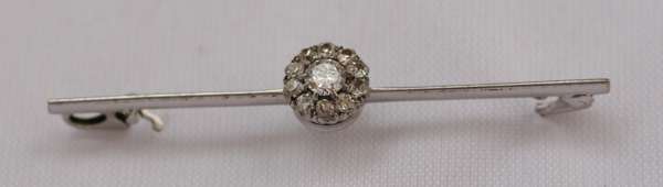 the simple flower head cluster of diamonds mounted on a platinum faced 15ct white gold bar brooch