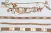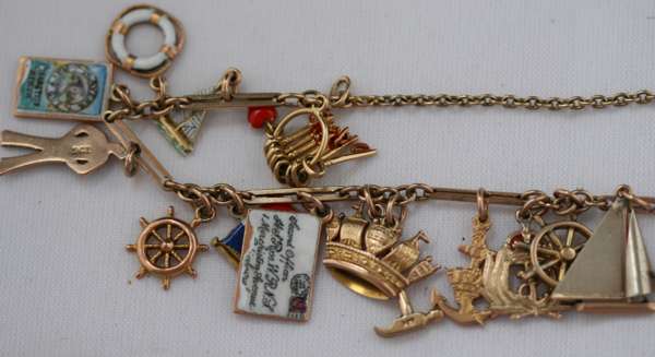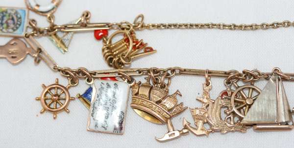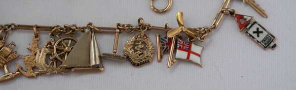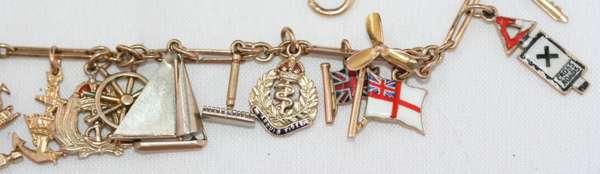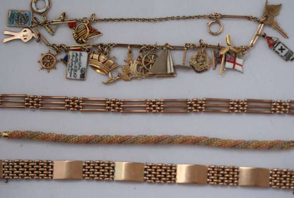 a gold charm bracelet with a large number of 9ct gold charms mostly enamelled and with nautical theme and a 9ct gold bracelet of ribbed links and polished panels, a gate bracelet and a mesh triple colour gold bracelet