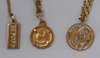 including; a 15ct gold neck chain with a pierced circular panel pendant with Chinese symbols, a 9ct gold pendant (8g) with a fine link neck chain, a 1 Rand coin in a plain mount with a gold neck chain (130cm long)