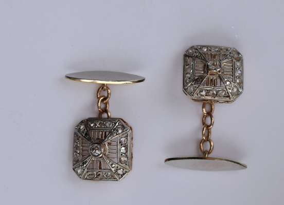 each with pierced canted square shaped fronts, millegrain set with borders of old mine and rose cut diamonds, with slim oval terminals conjoined by belcher form links