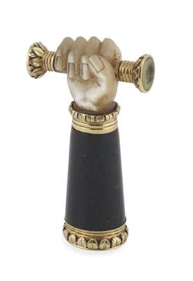 unmarked, the main shaft formed from a tapered cylinder of bloodstone with matrix to base, with mother of pearl carved hand terminal, the hand holding a rod with twin matrices