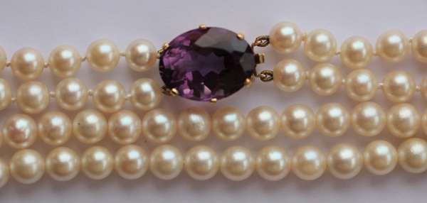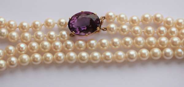 A two-row cultured pearl necklace with amethyst set clasp