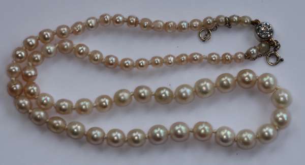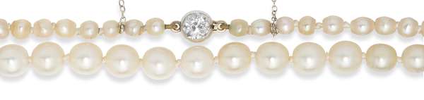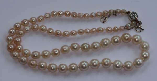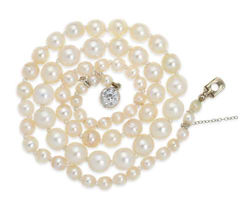 a single string of graduated natural saltwater pearls (tested), the clasp set with a single mine cut diamond with a safety chain
