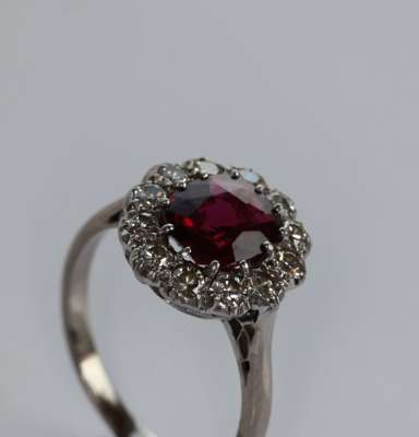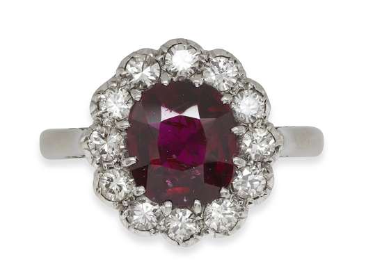 the central claw set oval cut ruby within a shaped oval border set with twelve round brilliant cut diamonds, with scroll pierced gallery