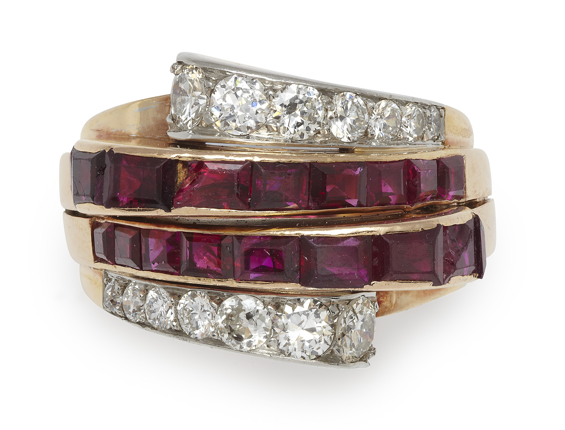 the front of cross-over design composed of two borders of channel set calibre cut rubies flanked above and below by two tapering borders set with graduated round brilliant cut diamonds