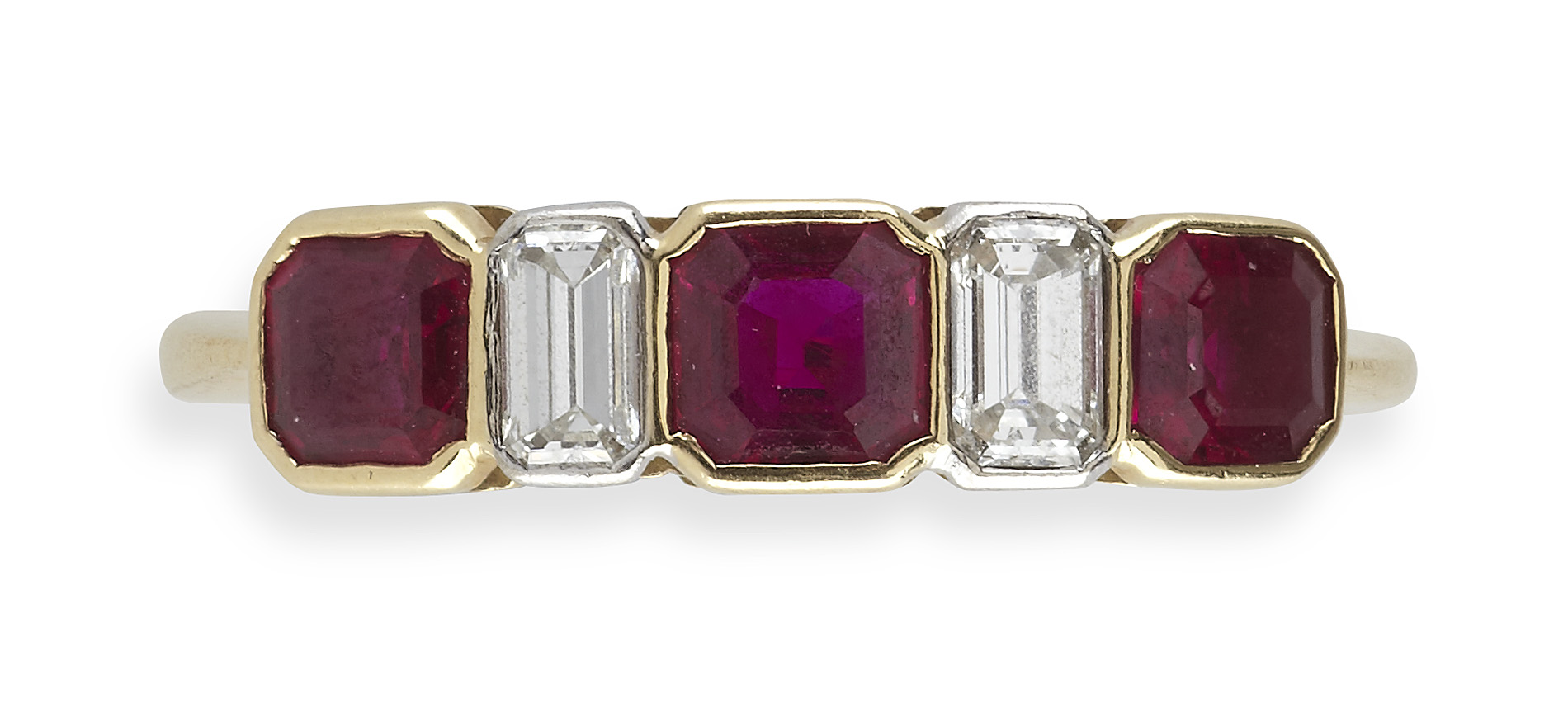 alternately set to the front with three square trap cut rubies interspersed by slim trap cut diamonds