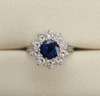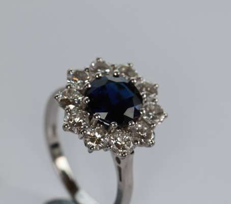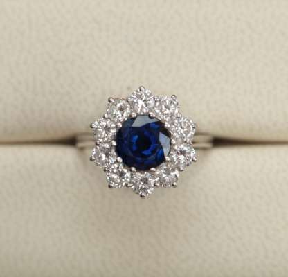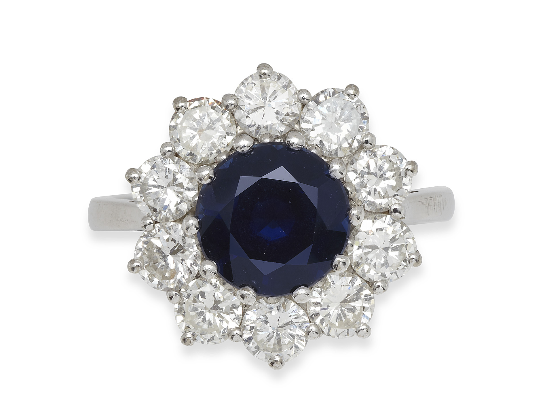 the central claw set circular cut sapphire within a surround of ten similarly set round brilliant cut diamonds