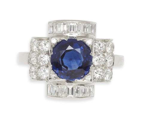 the central circular cut sapphire within a corner box setting, flanked to either side by a curved rectangular panel pave set with round brilliant cut diamonds, additionally flanked above and below by borders of channel set baguette cut diamonds, with lozenge pierced gallery, shank numbered 2562