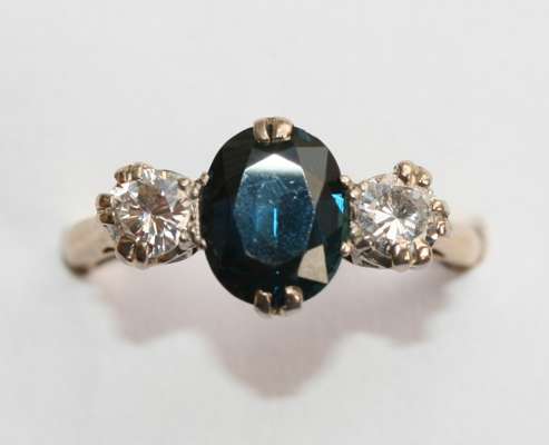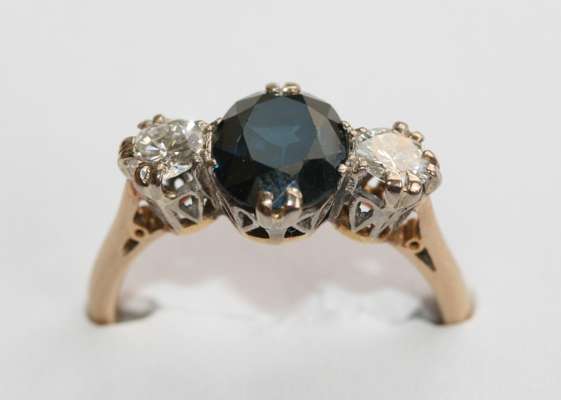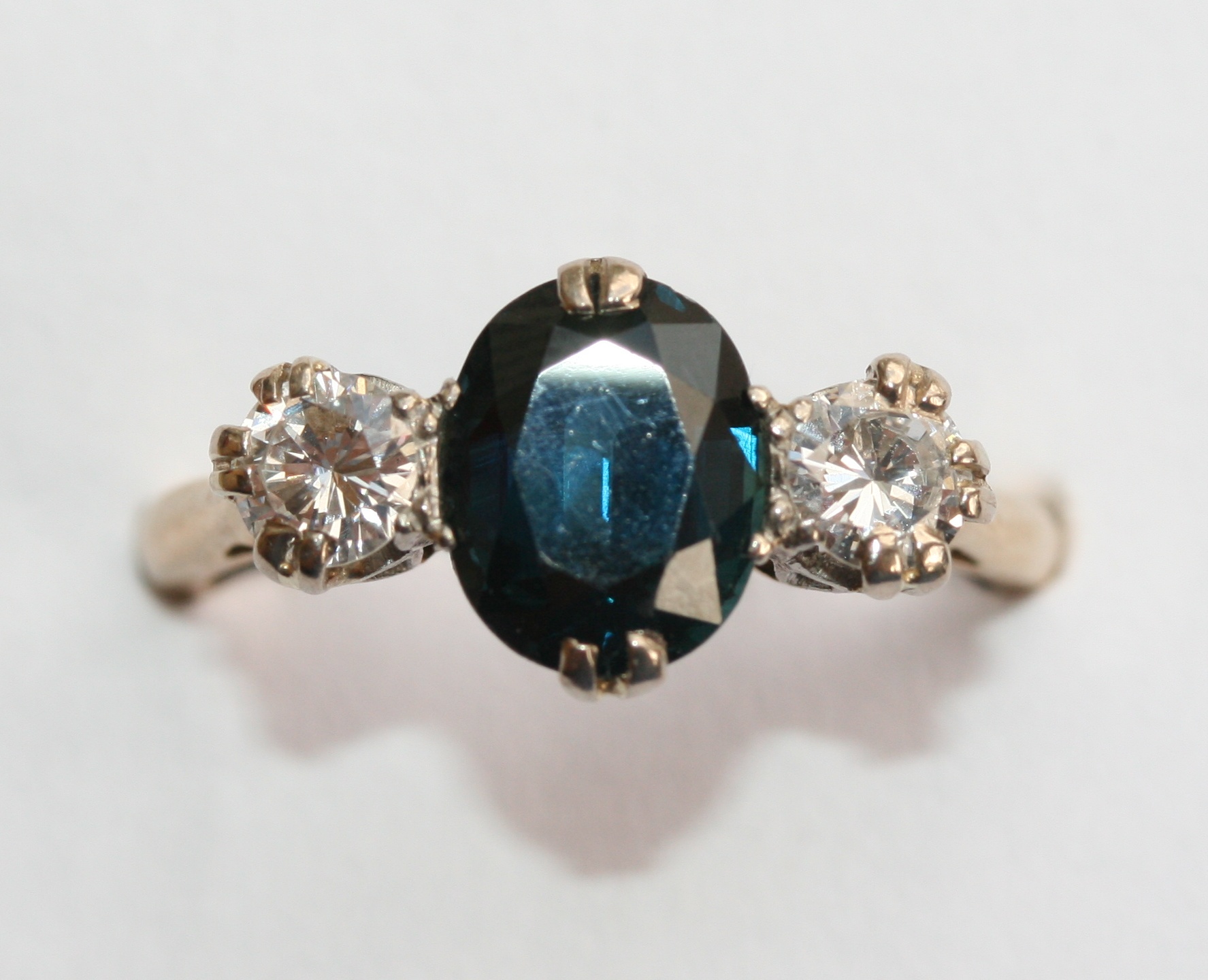 the principal sapphire of oval shape, flanked by two diamonds claw set in platinum with a pierced gallery, shank stamped 15ct and plat