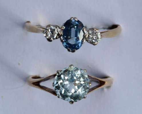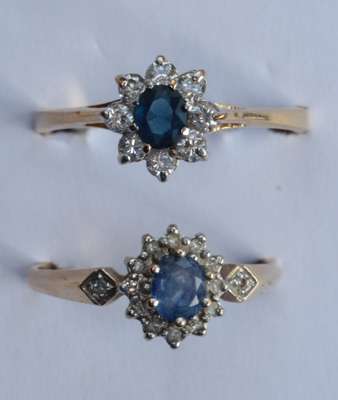 to include an 18ct gold mounted sapphire and diamond set three-stone ring, a 9ct gold mounted sapphire and diamond set oval cluster ring, an 18ct gold mounted circular cut aquamarine set ring, and a blue and colourless gem set dress ring, stamped M&S (4)