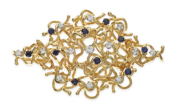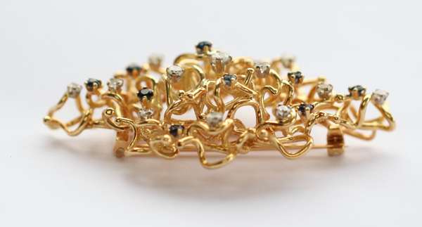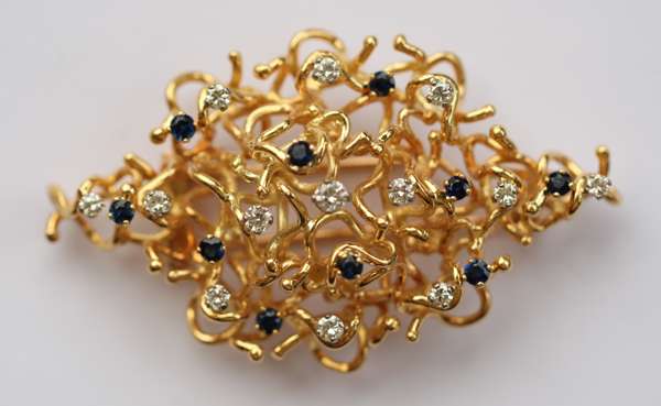 in the modernist style, of lozenge form, composed of scrolls, claw set throughout with round brilliant cut diamonds and sapphires