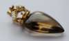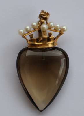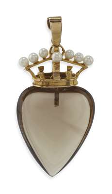 composed of a heart cut smoky quartz cabochon, surmounted by a coronet set with small cultured pearls, with tapering scroll form bale