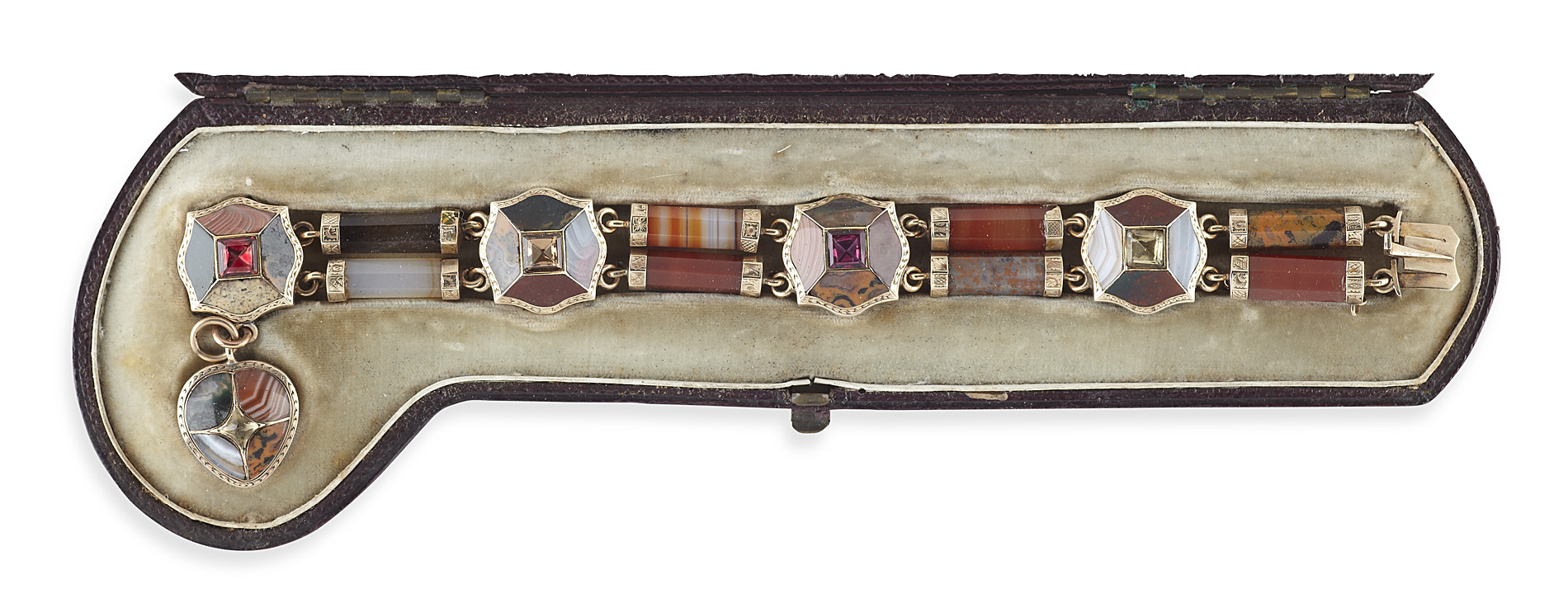 composed of two rows of faceted cylindrical assorted hardstone beads interspersed by shaped square links also set with assorted hardstone panels, with foliate scroll engraved mounts, concealed clasp and safety chain and similarly set and mounted heart shaped drop, with glazed aperture to reverse, contained in a tooled leather fitted case stamped MARSHALL & SONS...EDINBURGH