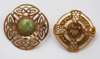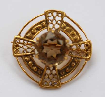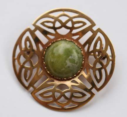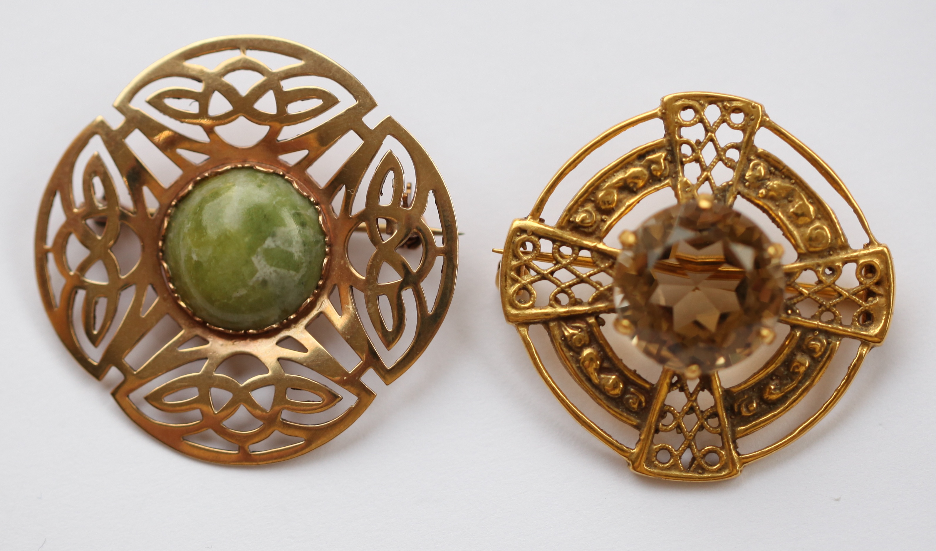 the first of open shaped circular design set to the centre with a circular cut green marble cabochon, together with a 9ct gold Celtic open circular design brooch, incorporating a stylised cross, claw set to the centre with a circular cut citrine; together with a heart form brooch; a harp form brooch attributed to Malcolm Appleby, engraved with Celtic knotwork borders, stamped 9ct (3)