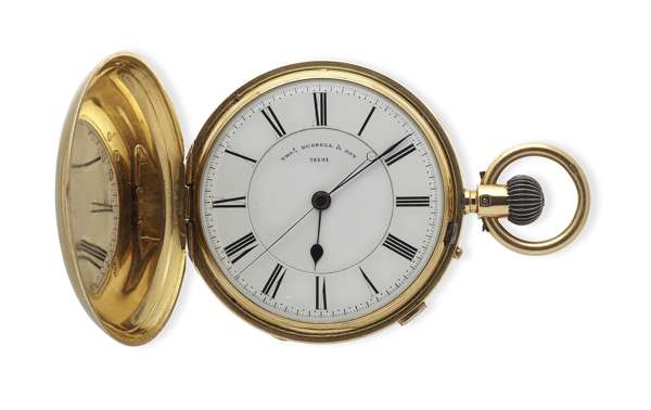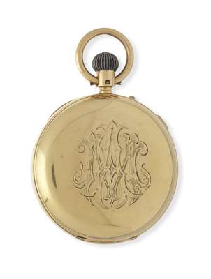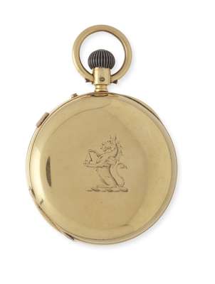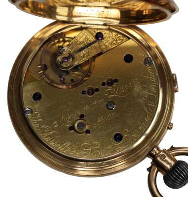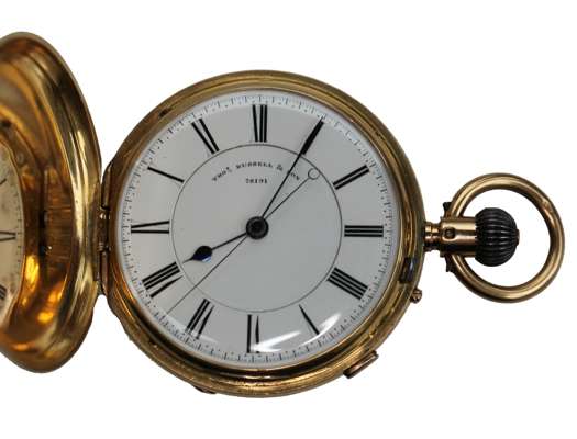 full hunting cases, engraved monogram and crest, white enamel dial inscribed 'Thos Russell and Sons' numbered '78191' keyless wind action with sweep second hand with stop start lever, three quarter plate movement inscribed