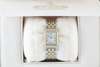 the slim rectangular dial with black Arabic numerals, with reeded bezel, swiveling to reveal a plain gold back, fitted to a two-coloured brick link bracelet with fold-over clasp with separate additional links, contained in the original box, with documents