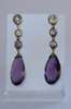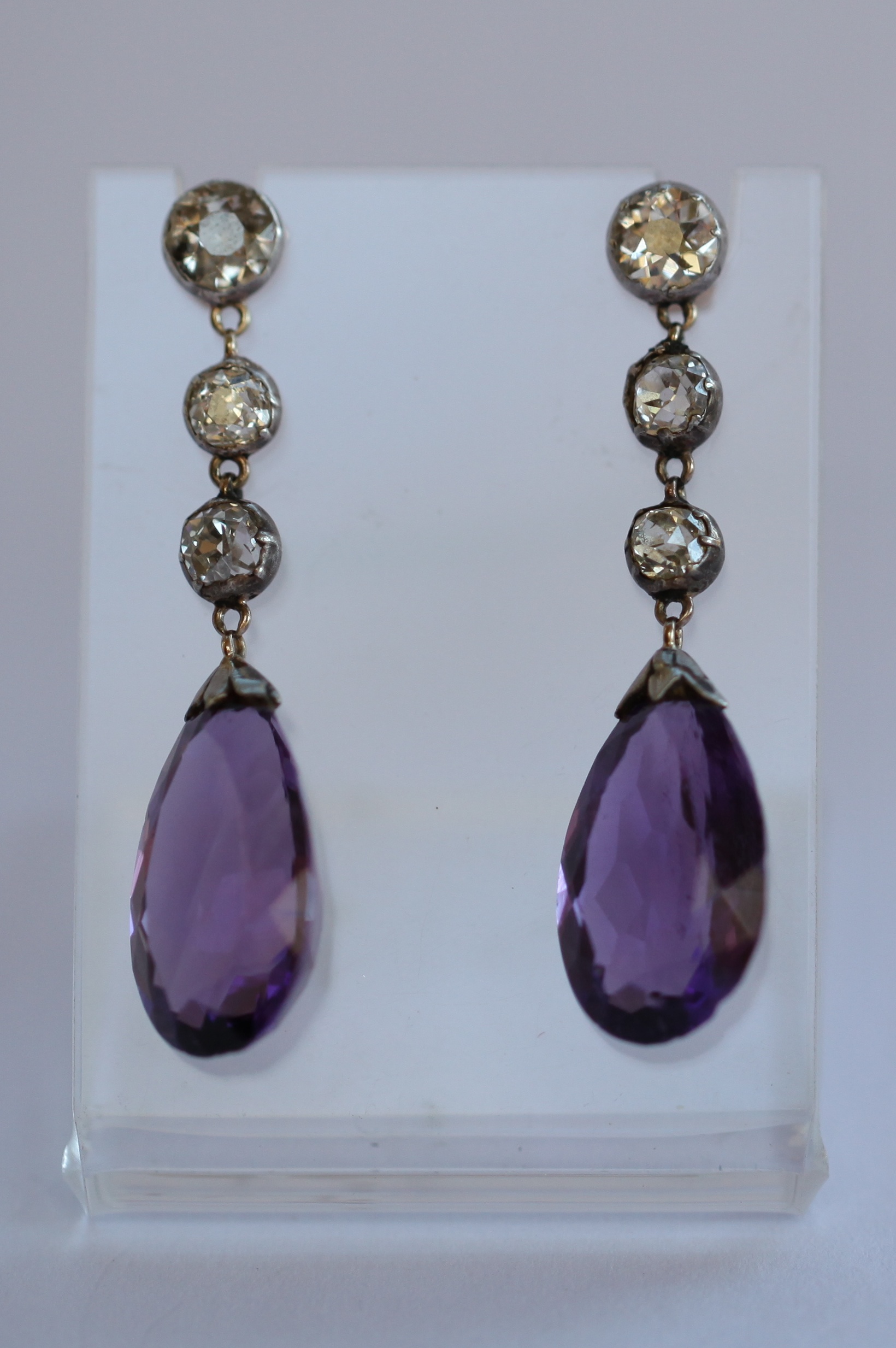 each collet set with three graduated old mine cut diamonds surmounting a pear cut amethyst drop, with post and butterfly fittings
