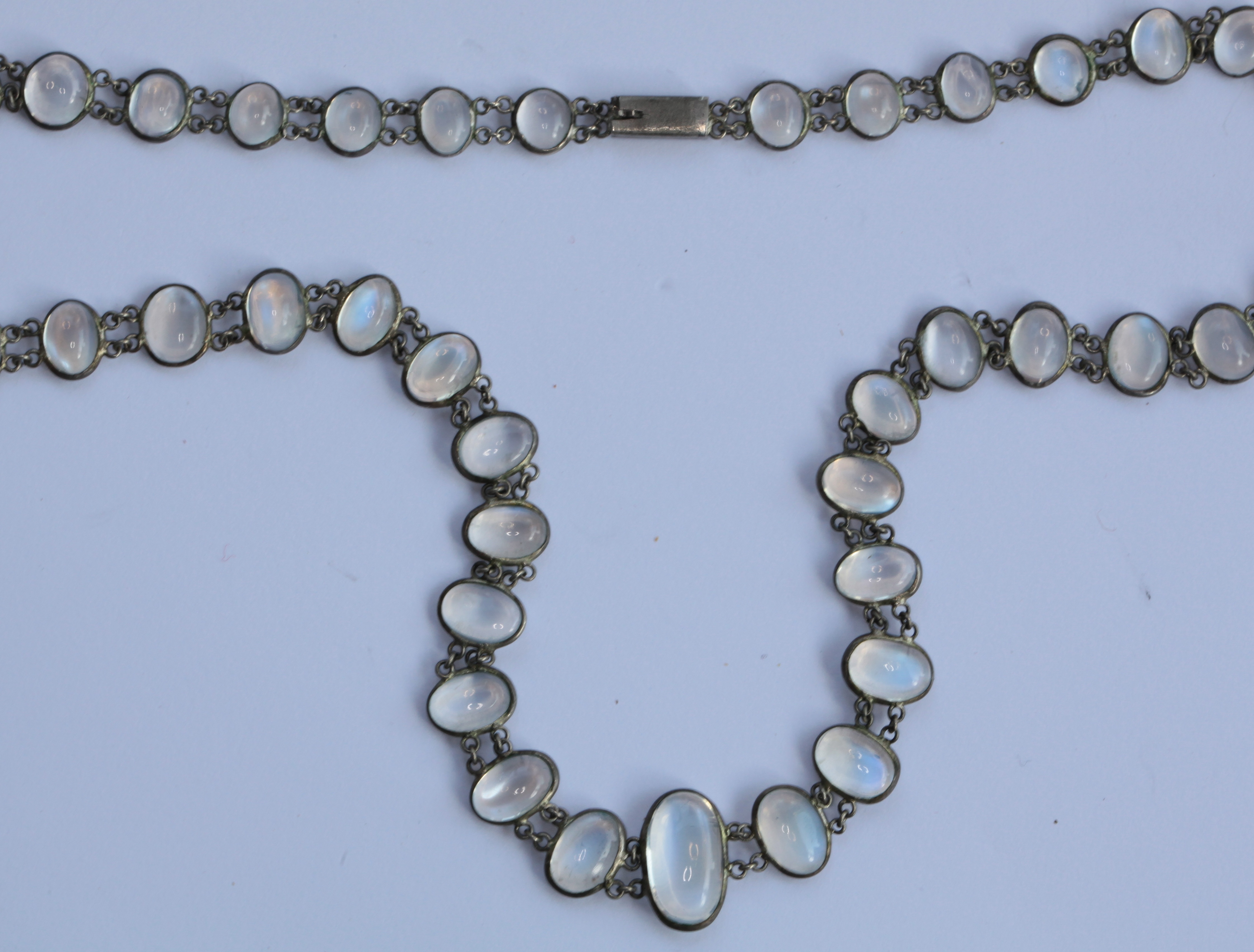 composed of graduated spectacle set oval moonstone cabochons conjoined by fine belcher links