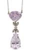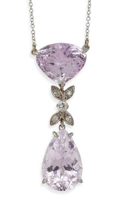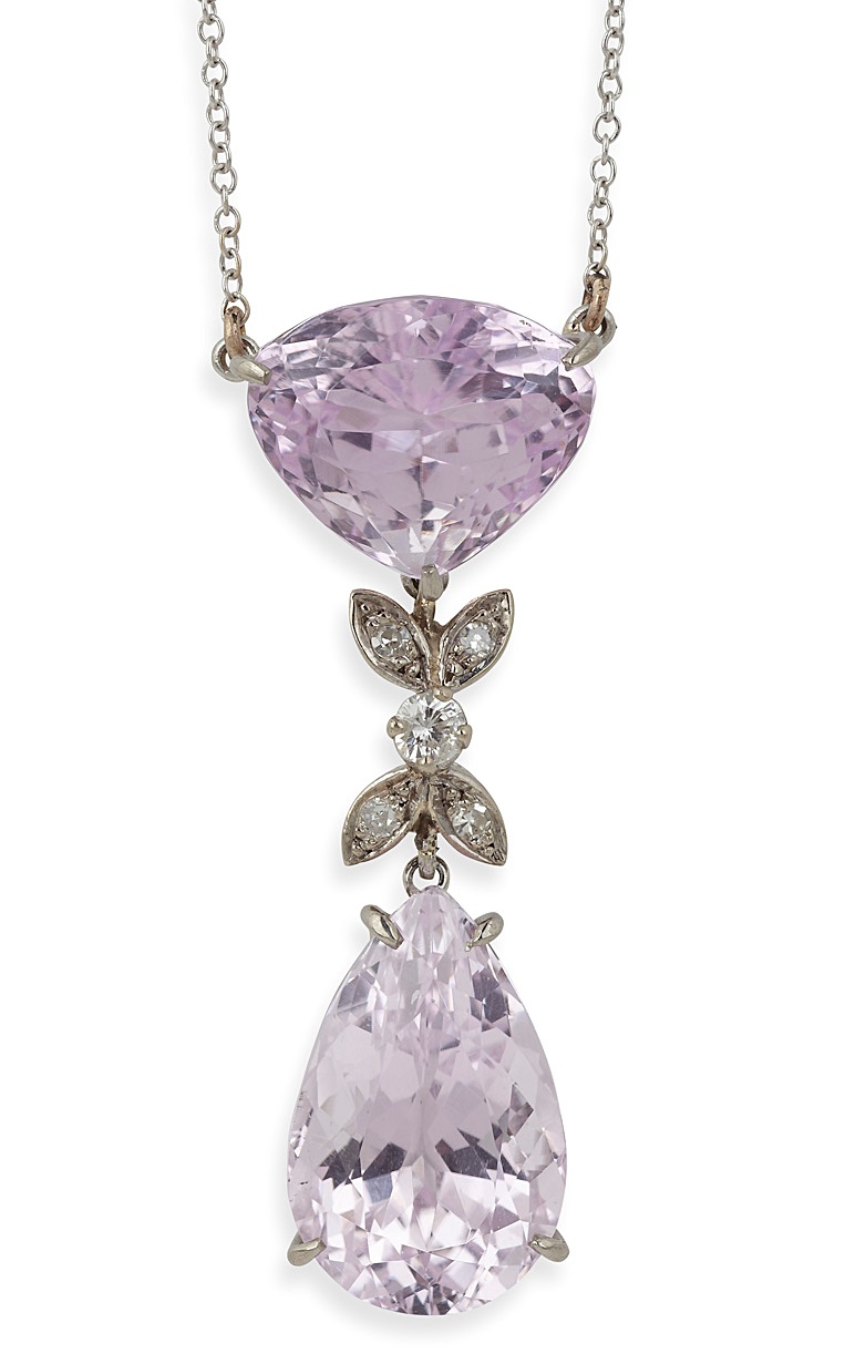 composed of a claw set fancy triangular cut kunzite surmounting a round brilliant and single cut diamond set foliate cluster, suspending a pear cut kunzite drop, the whole suspended from a fine belcher link chain
