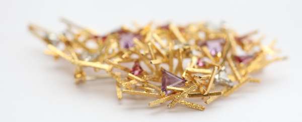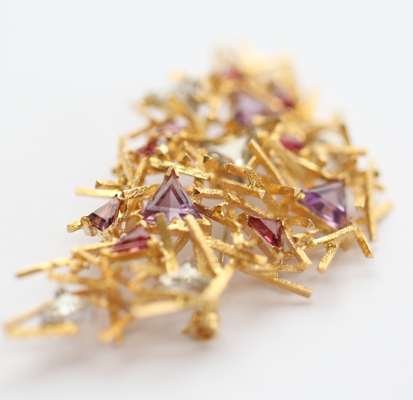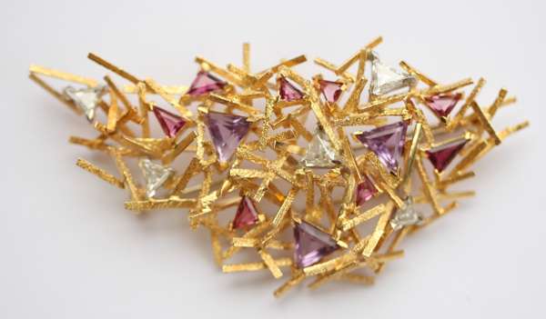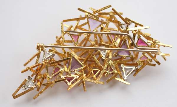 in the modernist style, of asymmetric shaped triangular design, composed ot textured overlapping bars, set throughout with graduated triangular cut diamonds, pink and purple gems, with hinged double pin fastening
