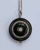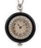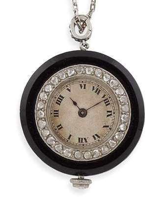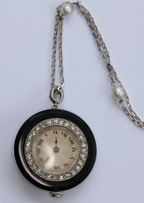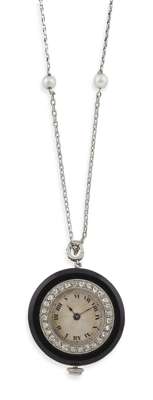 the circular onyx frame with a watch movement, diamond set bezel, similar to back with central diamond, the movement unsigned, the diamond set bale numbered 1770, all on a long French control marked chain with eight small natural pearl spacers