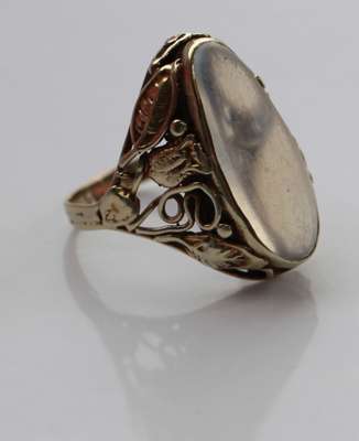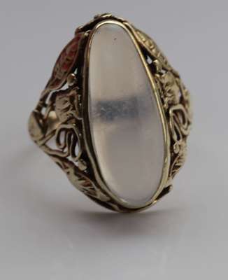 collet set with a tapering oval cut moonstone cabochon, within a scrolling surround composed of flowers and foliate scrolls, to a reeded shank, stamped 14K