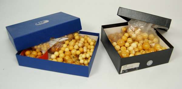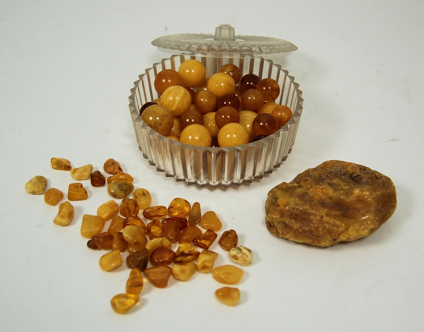 to include a quantity of drilled amber beads of various sizes, all of a creamy yellow colour; together with a quantity of polished amber samples, some drilled of various colours; and a quantity of rough samples (qty)