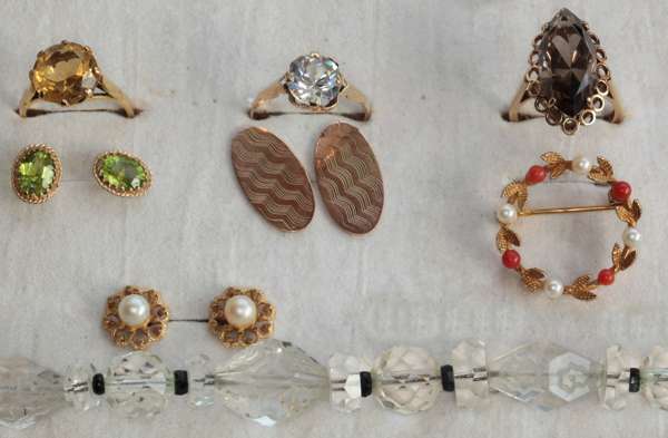 indistinctly marked, an Art Deco crystal necklace, a pair of earstuds, oval mounted stone gold ring, circular citrine gold mounted ring, pearl studs, oval cufflinks, a silver cufflink, turquoise ring, coral brooch, paste diamond ring (Qty)