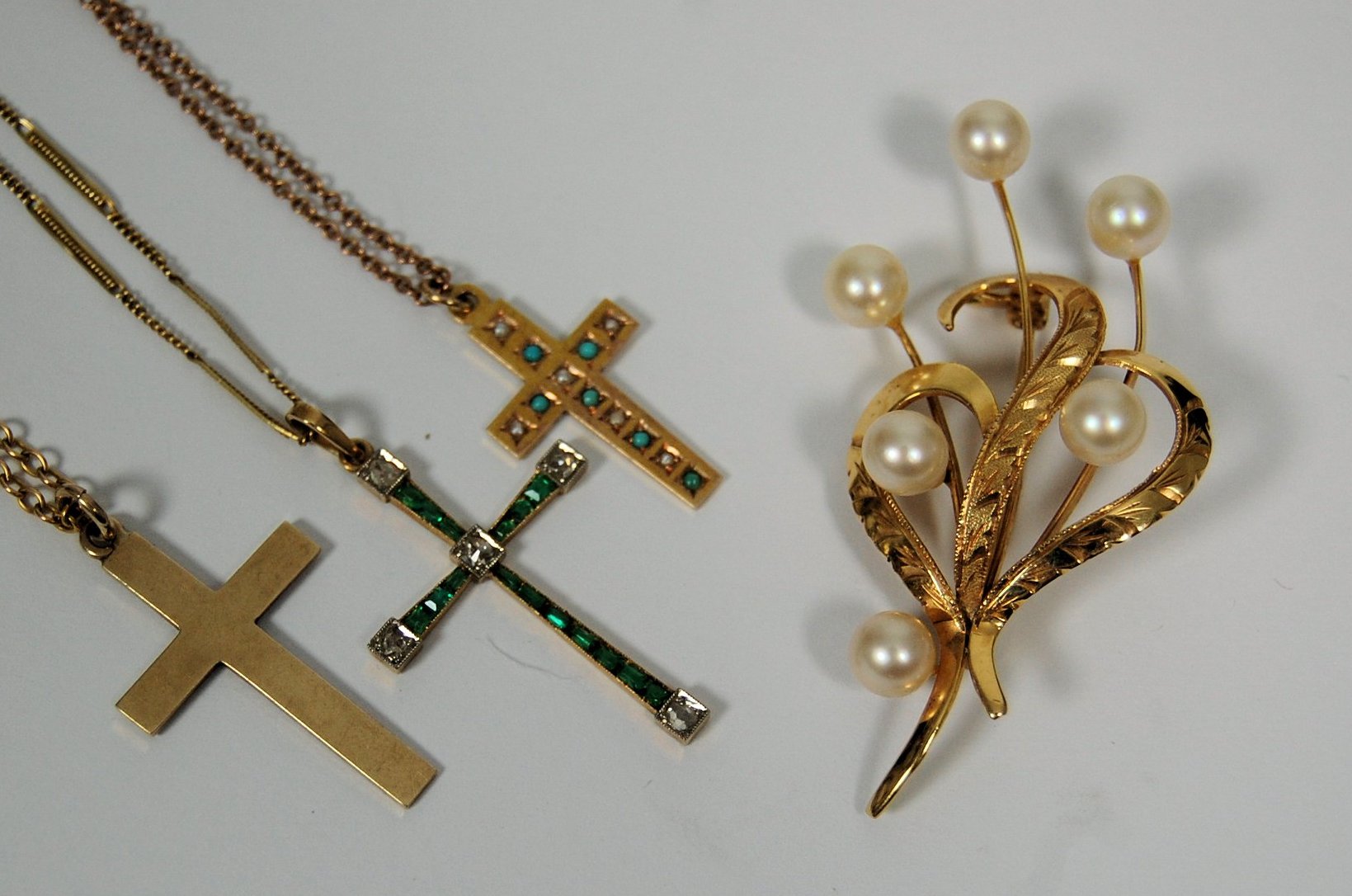 the baguette cut emeralds set in yellow metal, the terminals set with old mine cut diamonds, to a fancy link chain; a 9ct gold plain cross with belcher link chain and barrel clasp; a 9ct gold cross with small turquoise cabochons and seed pearls, to a belcher link chain and plain clasp; a pearl set brooch, the scrolling yellow metal arms with engraved detail, set with six cultured pearls, with brooch fitting, stamped 14k (4)
