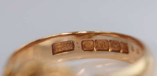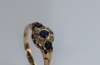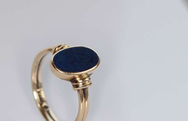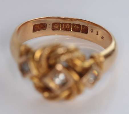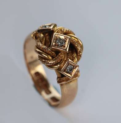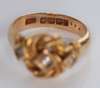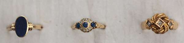 to include an 18ct yellow gold ring, with textured knotted design to the front claw set with three 'eight' cut diamonds to a plain shank; an 18ct yellow gold sapphire and diamond set ring, collet set to the centre with an oval cut sapphire, in a border of eight old-mine cut diamonds and two circular cut sapphires; a 14ct yellow gold ring, collet set to the centre with an oval lapis lazuli tablet (3)