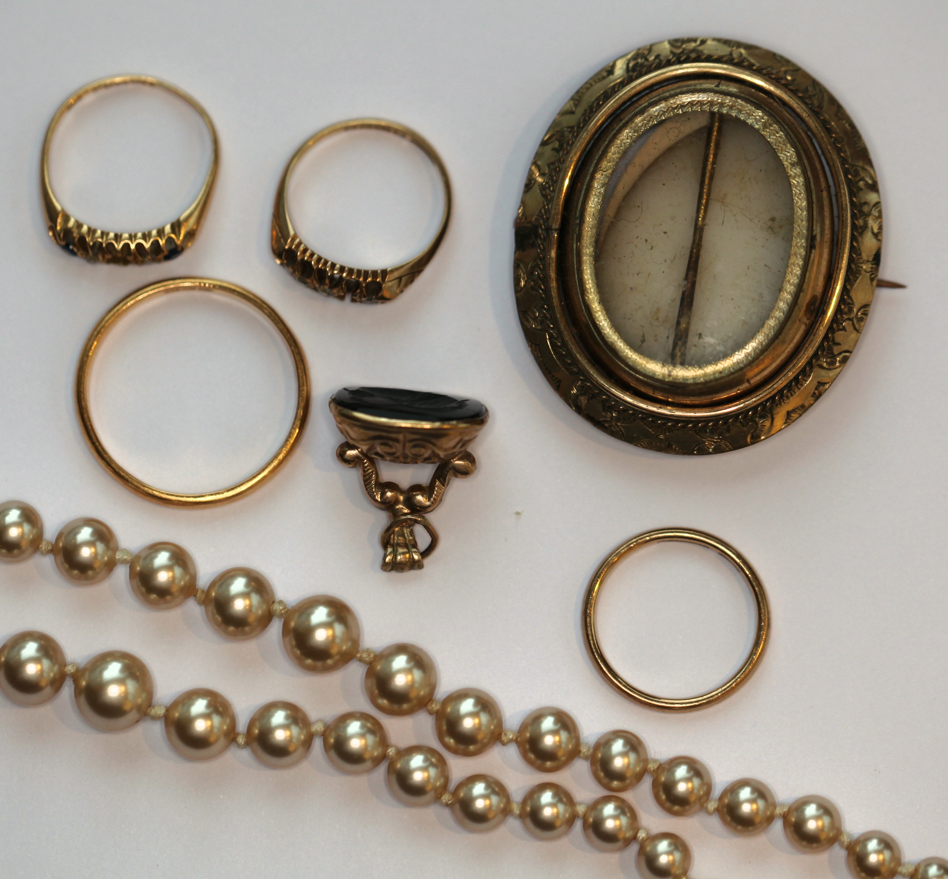 to include, two wedding bands, string of faux pearls, gold seal, a diamond set ring with one stone lacking and a ring set small sapphires and diamonds