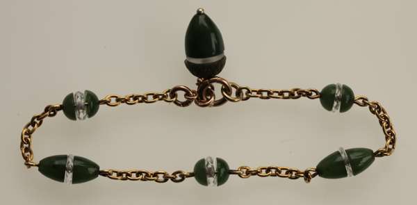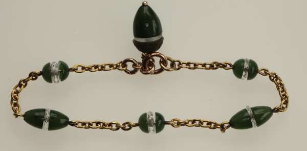 composed of belcher form links, set at intervals with hemi-spherical carved nephrite jade beads, interspersed by faceted rock crystal spacers, suspending a similarly set acorn shaped fob, stamped with Russian control marks