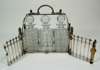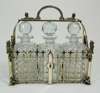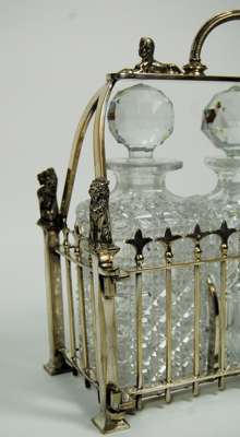 unmarked, the silver plated frame of rectangular outline with lion surmounts on corners and 'gated affect' sides, with locking and hinged front section, with open work handle with sphinx details and loop handle, enclosing three cut glass decanters and stoppers