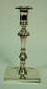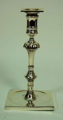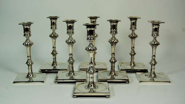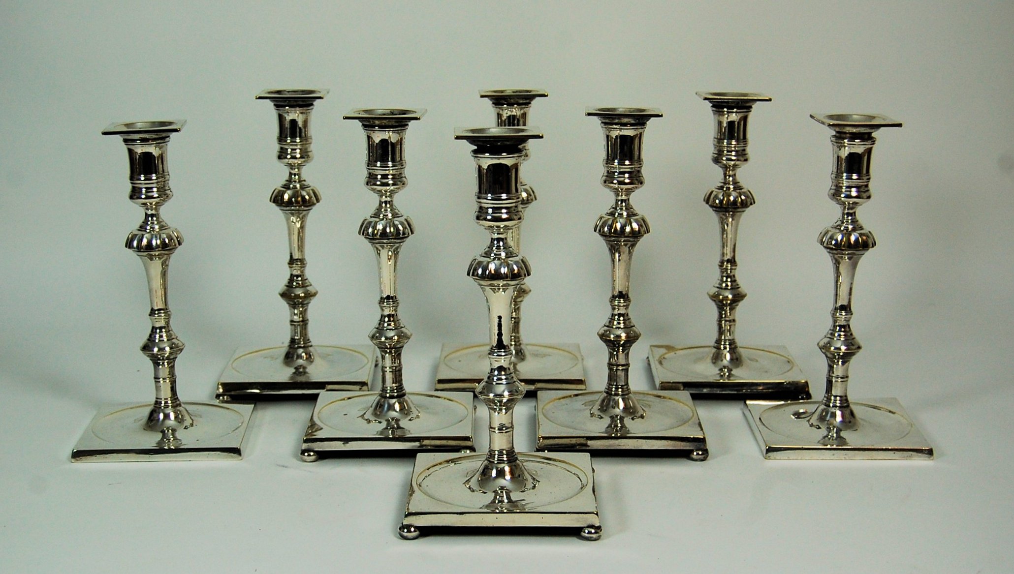 the square drip plate raised on a baluster stem with fluted detail, all to a square base raised on four ball feet, together with a similar example lacking the ball feet (8)
