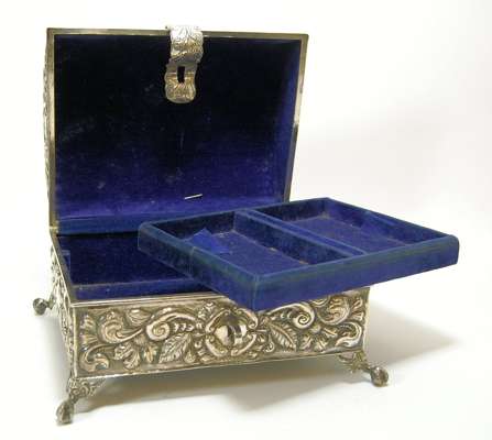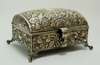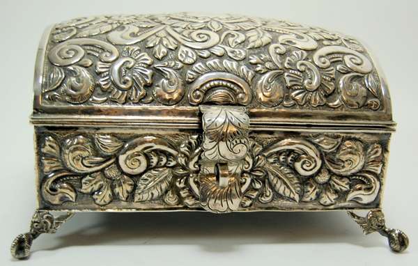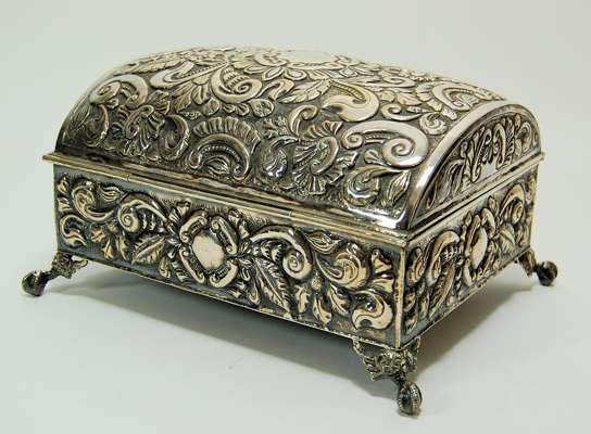 marked 900, of rectangular outline with hinged domed cover and raised on four bracket claw and ball feet, with all over embossed foliate scrolls and vacant cartouche
