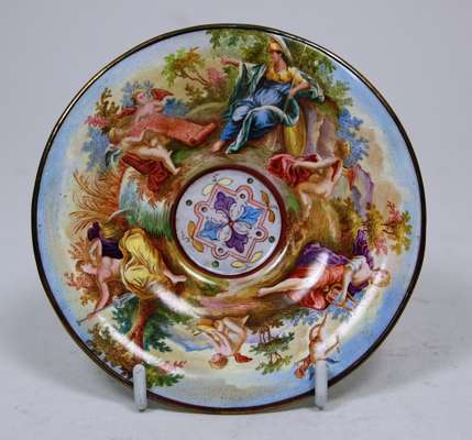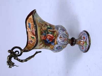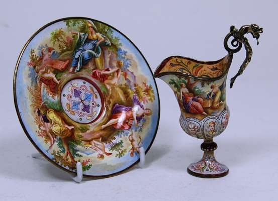 apparently unmarked, the ewer of classical form with lobed lower section and cast figural grotesque handle, the stand of shallow circular form with central well for foot, each piece profusely decorated with classical figures and landscapes (2)