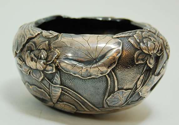 with character mark to base, of tapered hemispherical from with embossed and chased decoration of lilies and pad on a pond, with scalloped rim
