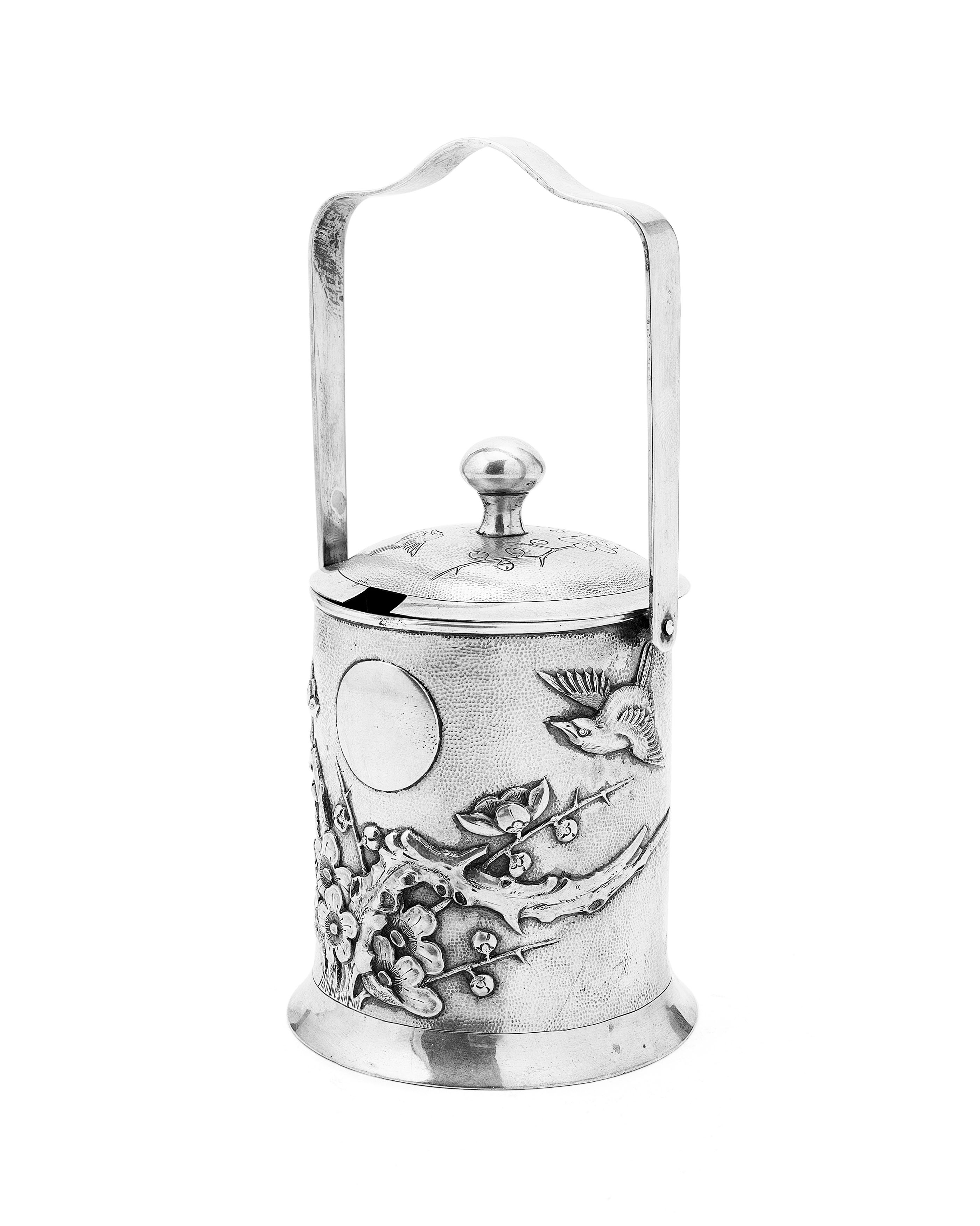 marked ZEE SUNG, SILVER, character mark, the cylindrical body with embossed naturalistic floral displays and birds, with a vacant circular cartouche and planished ground, with a simple swing handle and engraved cover