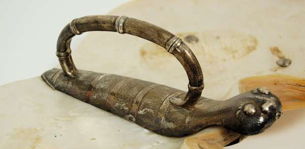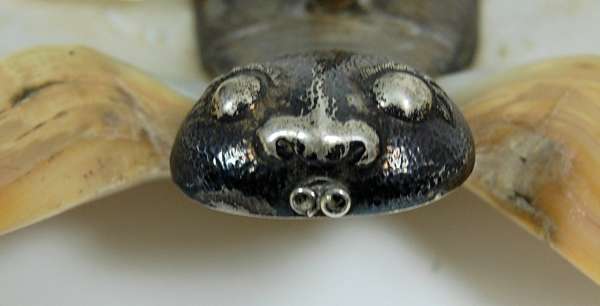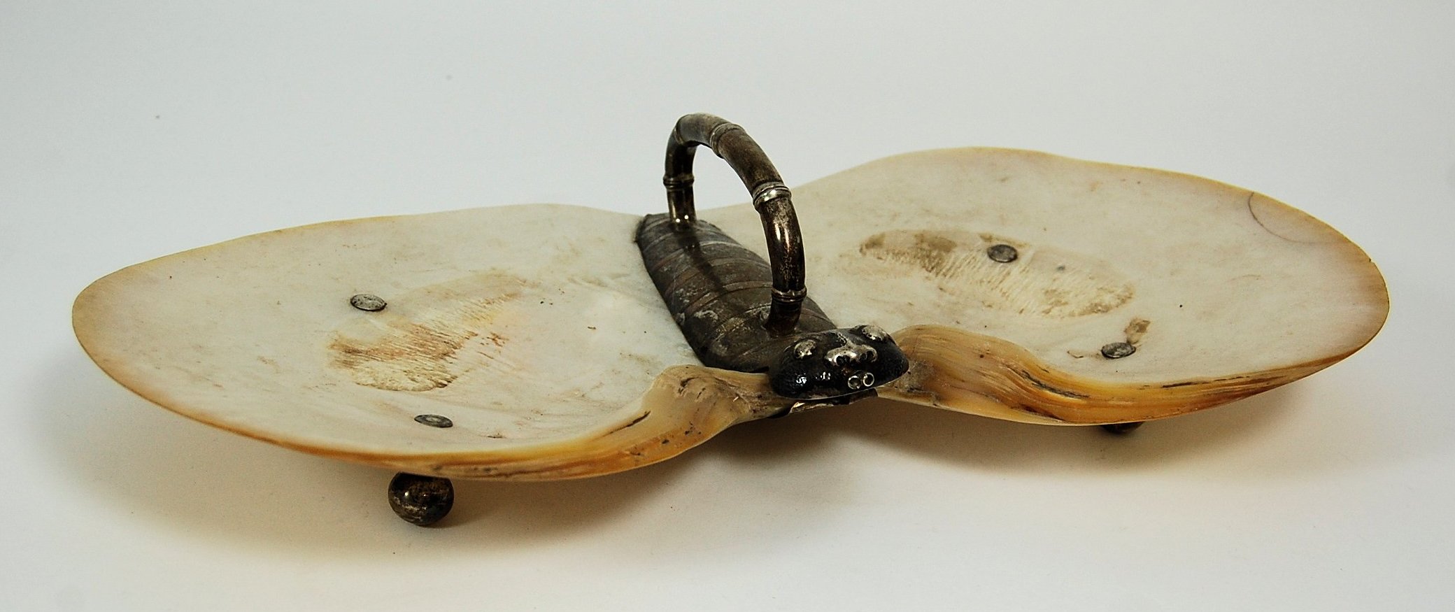 marked AHBOO, the large polished mother of pearl dishes forming wings with naturalistic mounts in shape of body and head