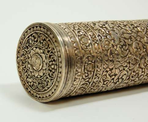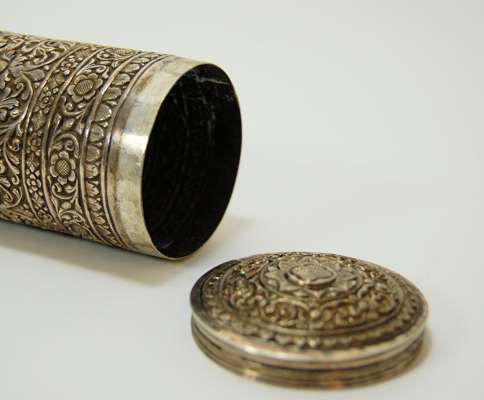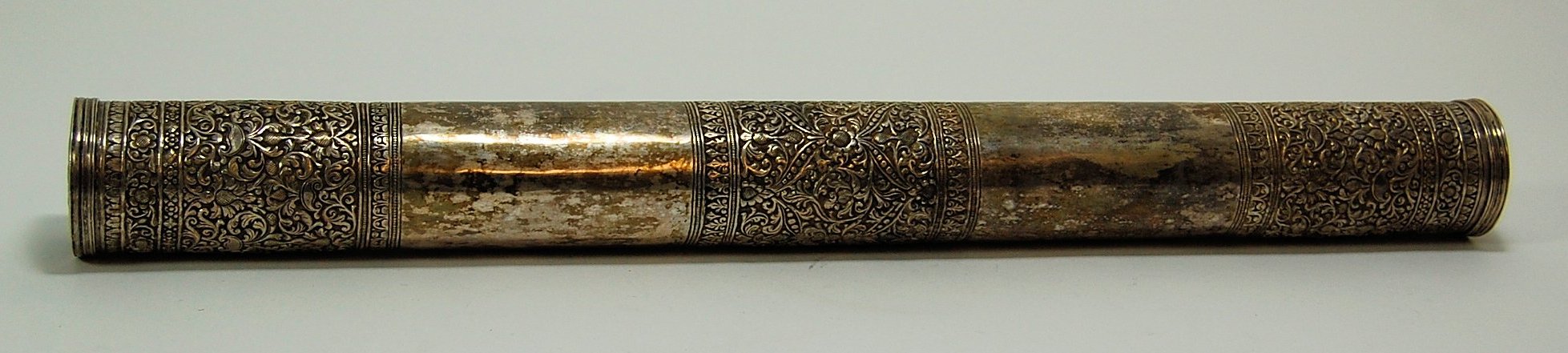 unmarked, the cylindrical tube with triple bands of chased foliate decoration, with similar decoration to base and pull off cover
